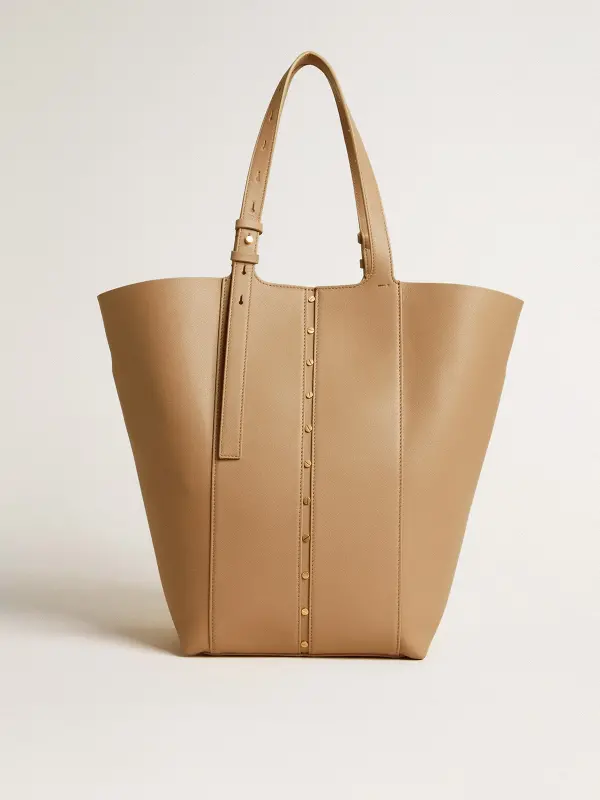 Tailored to meet the demands of metropolitan life, the 24/7 bag pays homage to the rhythm of the city. It offers two bags in one, allowing you to seamlessly move through your busiest days and nights. This classic version of the North South model in cappuccino-color leather features adjustable double handles and side fastenings, allowing you to change the width of the bag. The gold-tone studs that highlight the Bag’s elegance add the finishing touch.