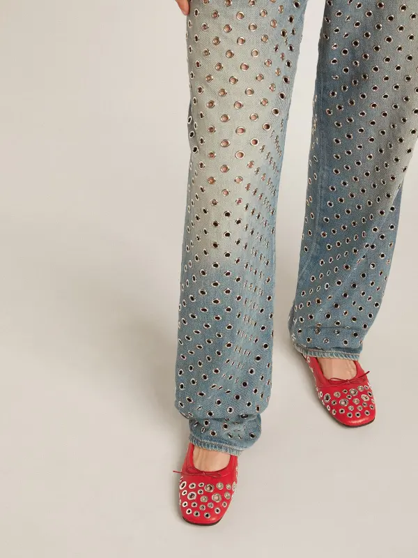 This version features a red nappa leather upper illuminated with silver-colored galvanic studs. The red leather bow on the toe and the galvanic silver metal zip on the heel complete the look.