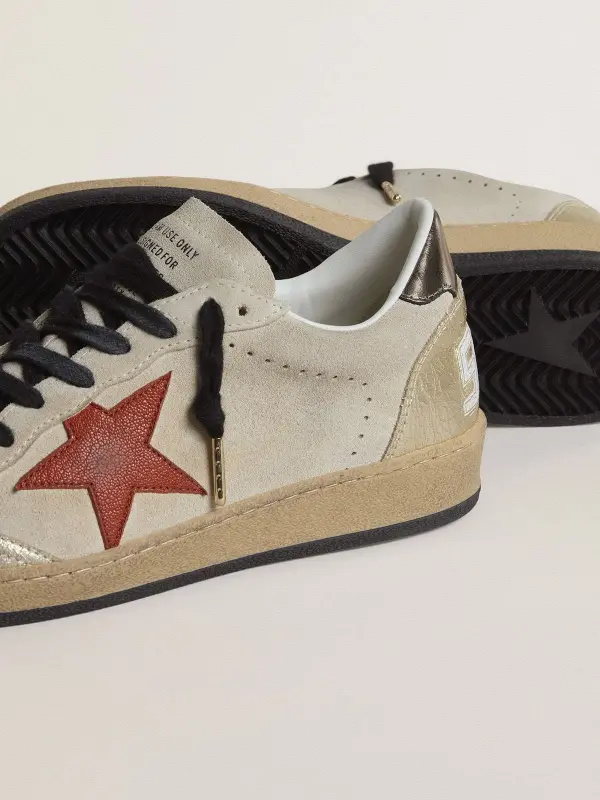 Dreaming of the Eighties. Our Ball Star sneakers have an American college vibe caught between a hoop shot and a skateboard ride. Like this model crafted in beige suede with platinum-colored foiled leather inserts, featuring a red leather star and metallic bronze-colored foiled leather heel tab. The black laces and the Sneakers writing on the heel in a white "heavy metal" font add the finishing touch: beautiful things that never go out of fashion.