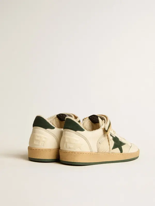 Dreaming of the Eighties. Our Ball Star sneakers have an American college vibe caught between a hoop shot and a skateboard ride. This model with a white nylon and nappa leather upper features a green suede star and heel tab. And the grosgrain velcro fastening with a white, green and beige stripe print, the white cotton edging and white laces add the finishing touch: beautiful things that never go out of fashion.