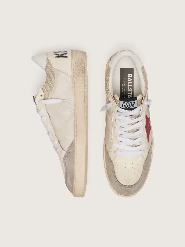 Dreaming of the Eighties. Our Ball Star sneakers have an American college vibe caught between a hoop shot and a skateboard ride. Like this model crafted in nylon and white mesh, featuring a red nylon star and white leather heel tab. The ice-gray suede insert on the toe, white laces and Sneakers lettering on the heel in a black heavy metal font add the finishing touch.
