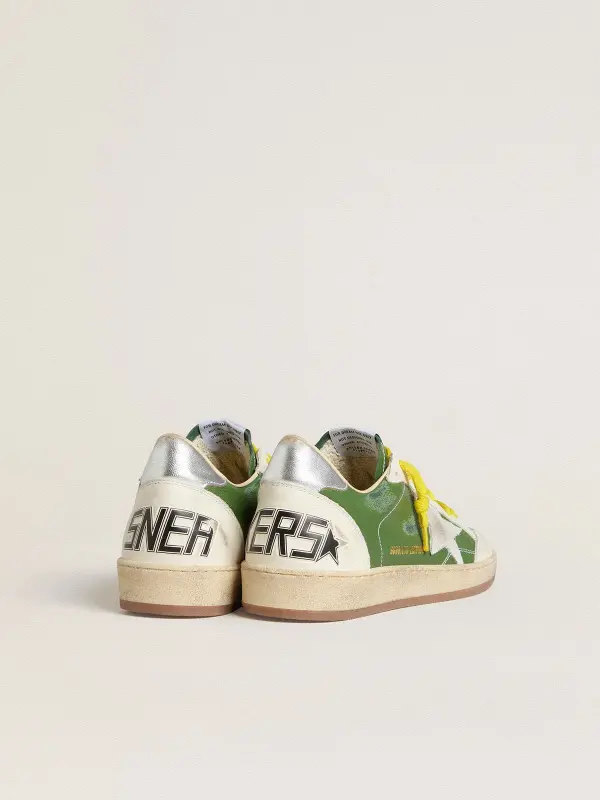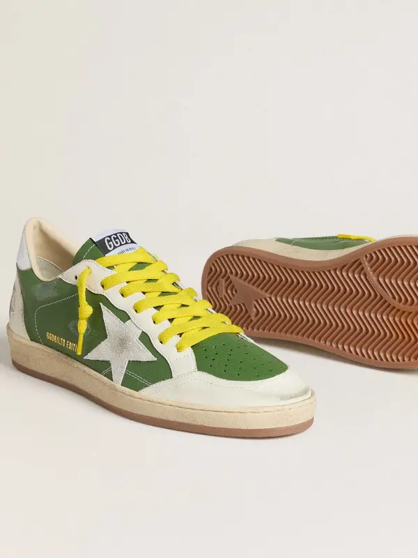 Dreaming of the Eighties. Our Ball Star sneakers have an American college vibe caught between a hoop shot and a skateboard ride. Like this model crafted in green nappa leather, featuring a white suede star and a silver metallic leather heel tab. The dirty-yellow laces and Sneakers lettering on the heel in a black heavy metal font add the finishing touch.