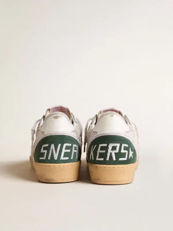 Dreaming of the Eighties. Our Ball Star sneakers have an American college vibe caught between a hoop shot and a skateboard ride. This model with a white crackle leather and mesh upper features a dove-gray suede star and a white leather heel tab. The green embroidered insert on the back and white laces add the finishing touch: beautiful things that never go out of fashion.