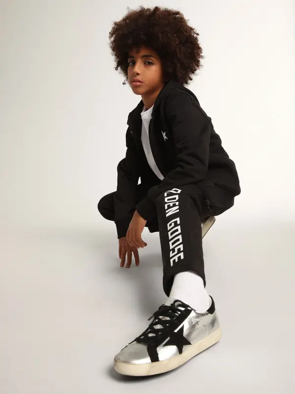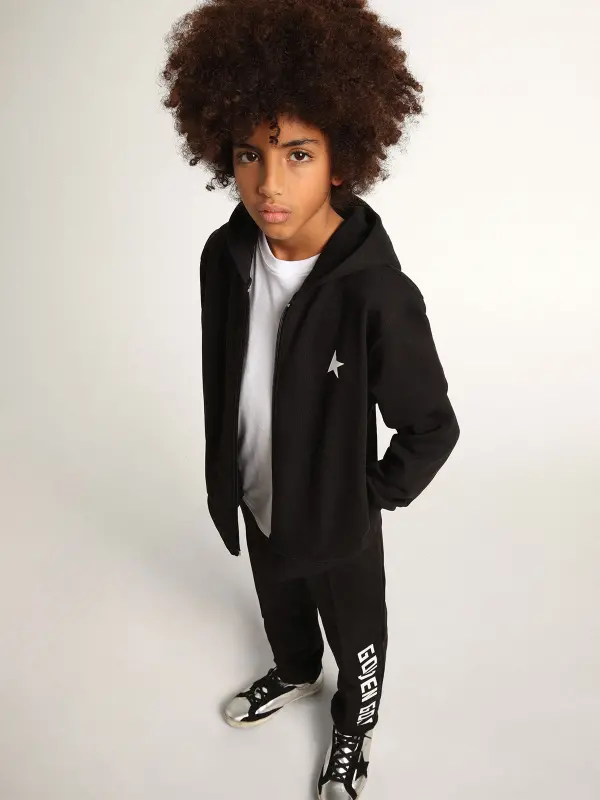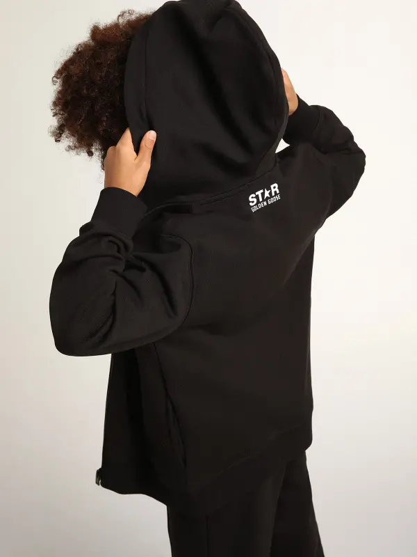 A collection with a casual soul but a versatile attitude: inspired by the Seventies, it has a timeless vintage appeal, suited to any occasion or look. This regular-fit hooded zipped sweatshirt in black pure cotton features a star on the front and logo on the back, both in white.