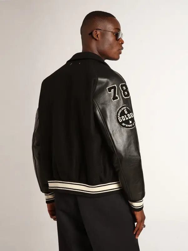 A unique, timeless collection that encapsulates the Golden Goose DNA, designed to remain with you every day, through thick and thin, come rain or shine. This boyfriend-fit bomber jacket in black wool fabric features leather sleeves with patches and contrasting white details.