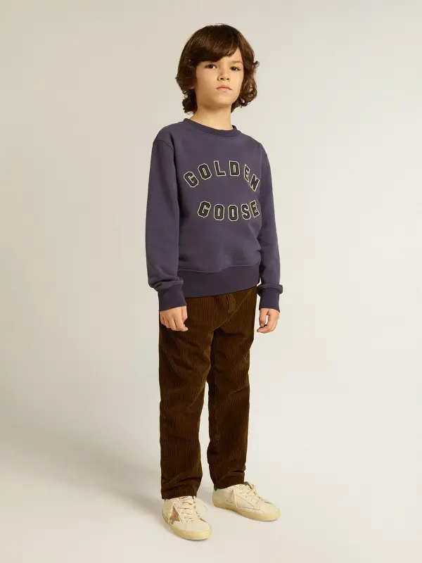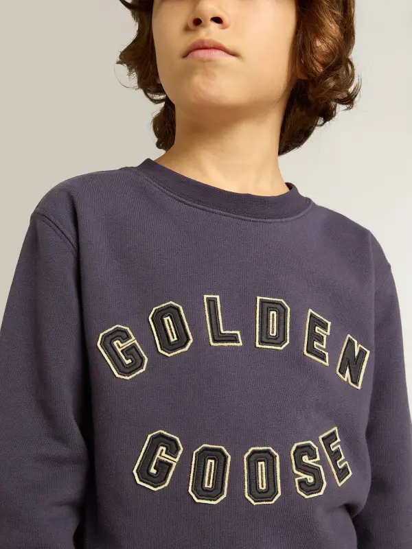 A love story to our home, Marghera. Where everything began. Our latest collection reflects the spirit of our birthplace, its contrasts, industrial soul, and manufacturing landscapes, weaving together inspirations from both the vibrant energy of workwear and the refined essence of traditional tailoring. This boys' regular-fit cotton sweatshirt in blue violet features Golden Goose lettering in patches on the front.