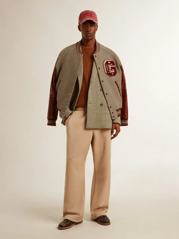 A love story to our home, Marghera. Where everything began. Our latest collection reflects the spirit of our birthplace, its contrasts, industrial soul, and manufacturing landscapes, weaving together inspirations from both the vibrant energy of workwear and the refined essence of traditional tailoring. In gray melange wool and with wine-red leather sleeves, this distressed bomber jacket features a thread-embroidered patch on the front, ribbed cuffs and hem, and a snap button fastening. Two central pockets add the finishing touch.