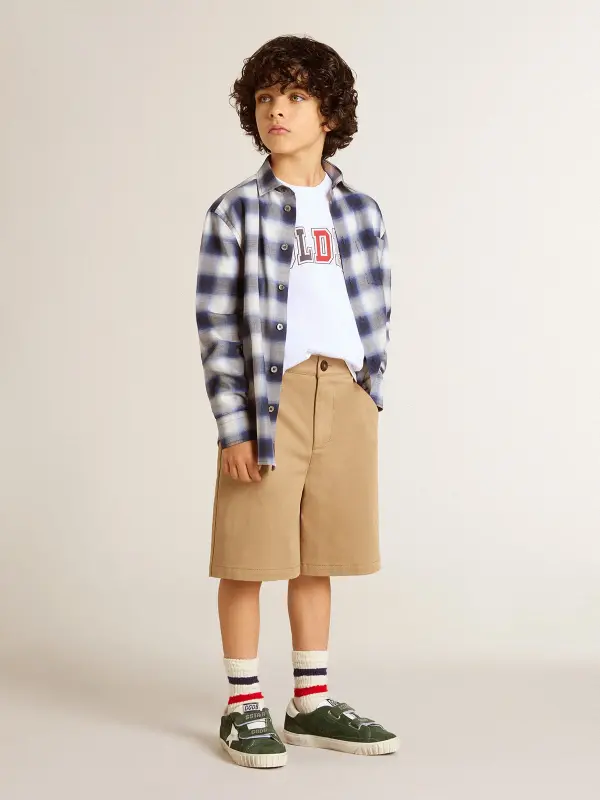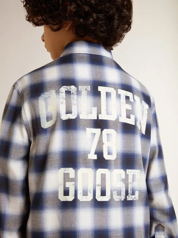 A collection created to be by your side at every moment, ready to accompany you on bright days and unforgettable adventures. This boys' cotton shirt in blue and white check features a white logo print on the back. The button fastening adds the finishing touch.