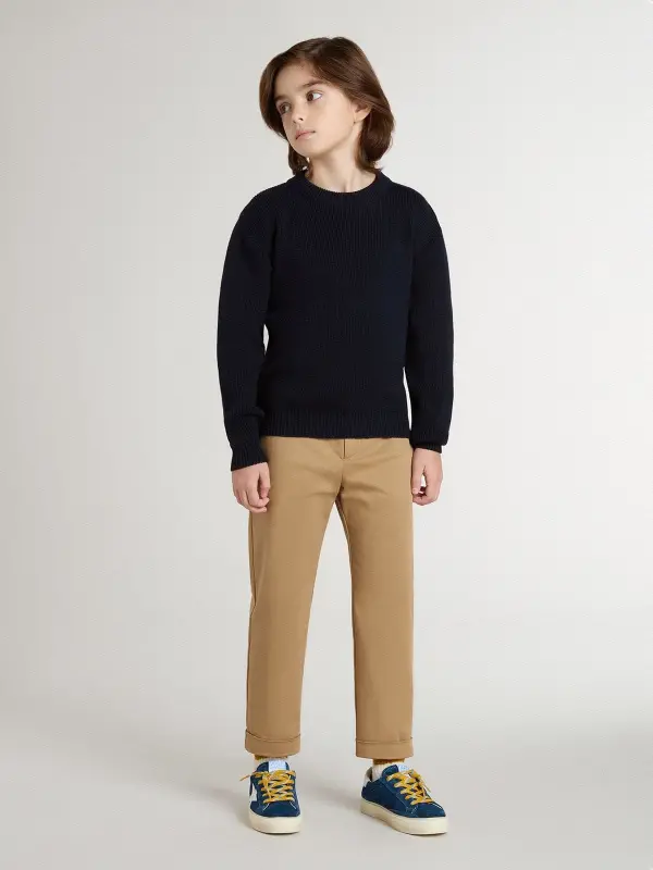 Boy’s blue crew-neck sweater with ‘Golden’ lettering on the back