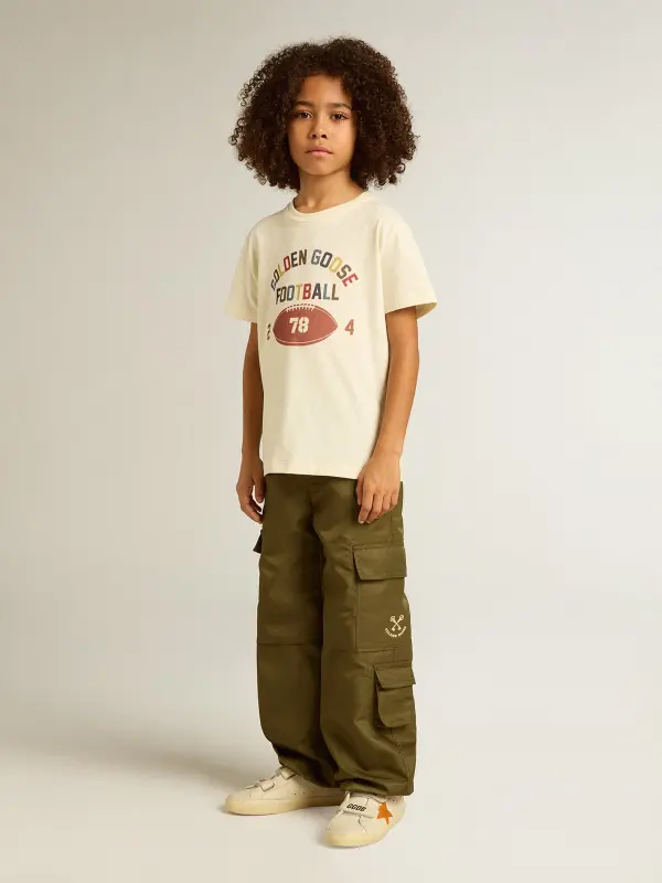 A love story to our home, Marghera. Where everything began. Our latest collection reflects the spirit of our birthplace, its contrasts, industrial soul, and manufacturing landscapes, weaving together inspirations from both the vibrant energy of workwear and the refined essence of traditional tailoring. This worn-white cotton T-shirt features multicolored Golden Goose Football lettering in the center.