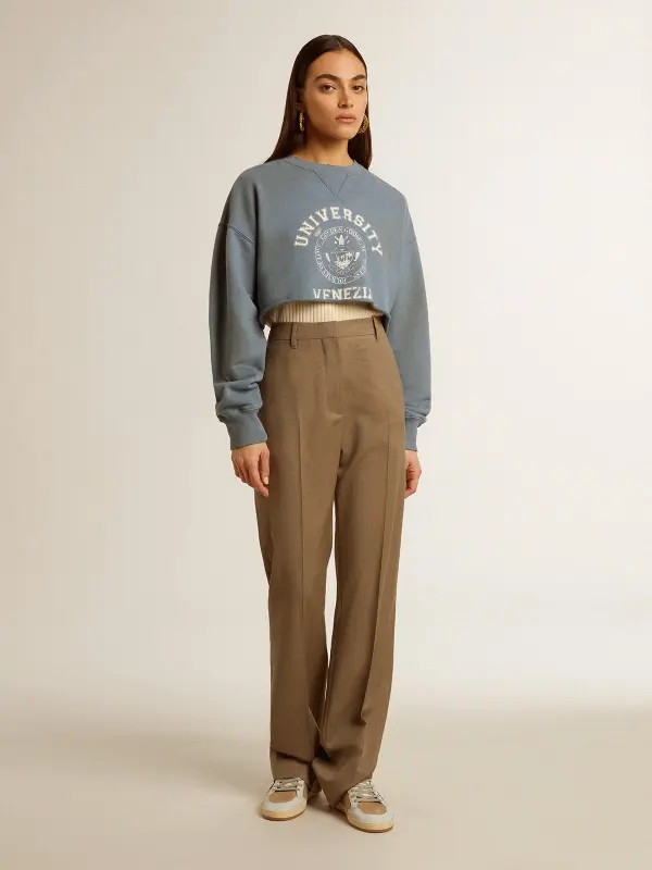 A love story to our home, Marghera. Where everything began. Our latest collection reflects the spirit of our birthplace, its contrasts, industrial soul, and manufacturing landscapes, weaving together inspirations from both the vibrant energy of workwear and the refined essence of traditional tailoring. In baby blue and inspired by American college style, this women's cropped sweatshirt features a distressed finish. The vintage “University of Venice” print, spraying detail and white distressing on the collar and cuffs make this sweatshirt a true one-of-a-kind.