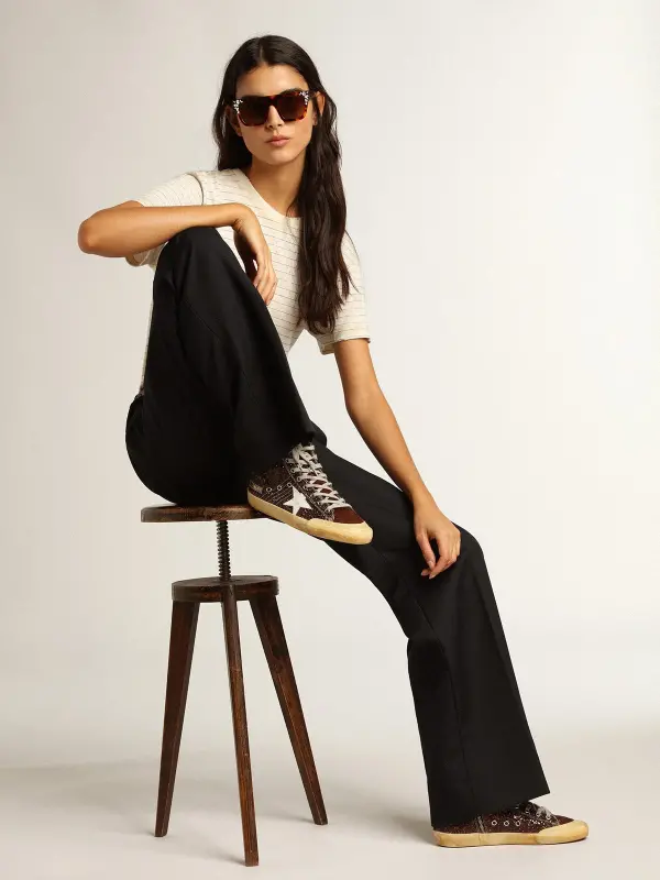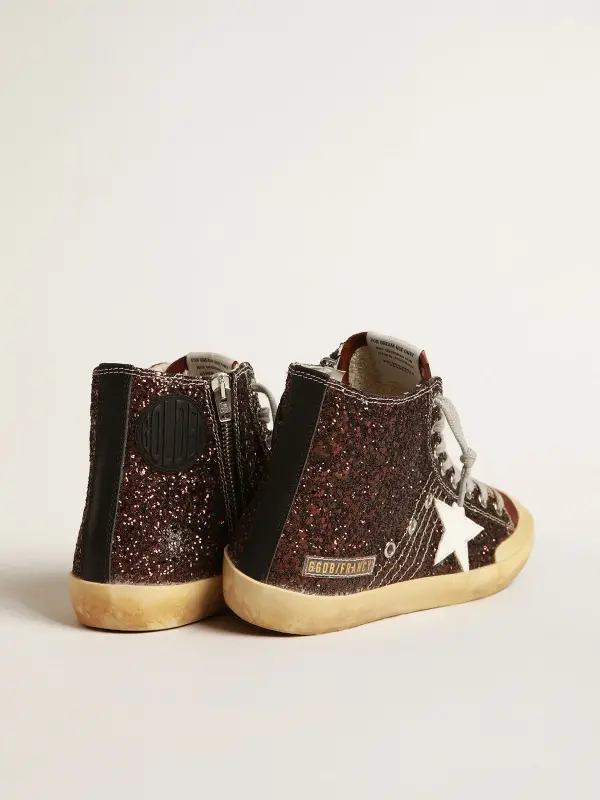 The Seventies, today: inspired by the world of basketball, the style of the Francy sneakers is updated with unexpected details and special finishes. These sneakers with a brown glitter upper feature a white leather star and black leather heel tab. The chocolate suede tongue and ice-gray laces complete the look.