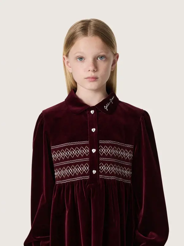 Girl’s burgundy velvet-effect dress with embroidery on the front