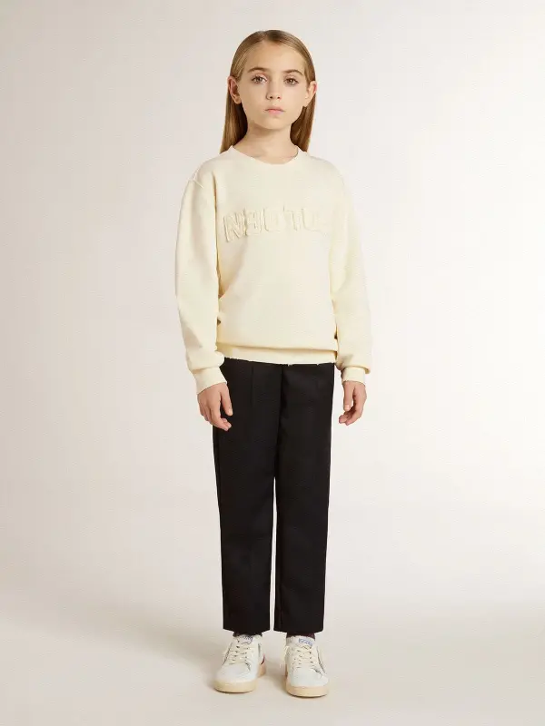 We’ve spent years creating, shaping, and reshaping, never settling for less. This girls' sweatshirt in cream-colored cotton features 'Golden’ lettering with reverse patches and distressed details.