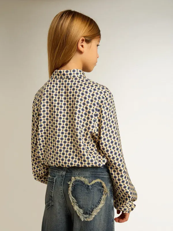 A love story to our home, Marghera. Where everything began. Our latest collection reflects the spirit of our birthplace, its contrasts, industrial soul, and manufacturing landscapes, weaving together inspirations from both the vibrant energy of workwear and the refined essence of traditional tailoring. Featuring a beige print with blue diamonds and black details, this girls' polo shirt features long sleeves and a mother-of-pearl button fastening.