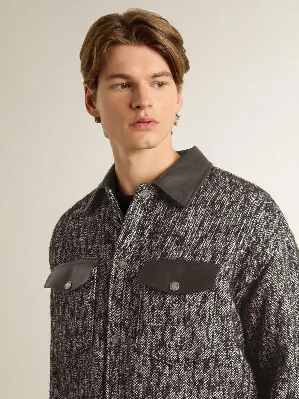 The third drop in our Fall/Winter 25 collection channels the funky glamor of the 1970s, a time when the night transformed into a canvas for unapologetic self-expression. Made of gray cotton blend with a herringbone motif, this unisex jacket features contrasting black leather details on the cuffs and collar. Two patch pockets with black leather detail and a snap button fastening add the finishing touch.