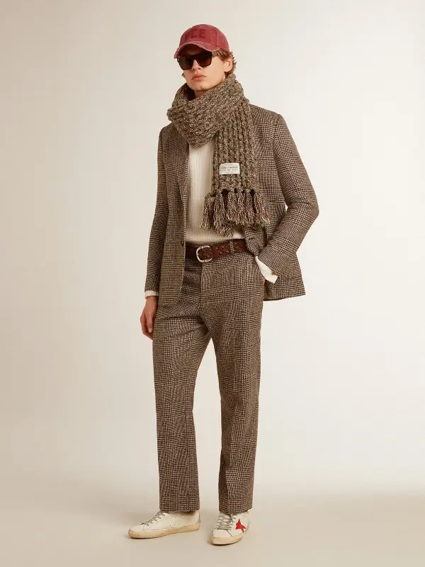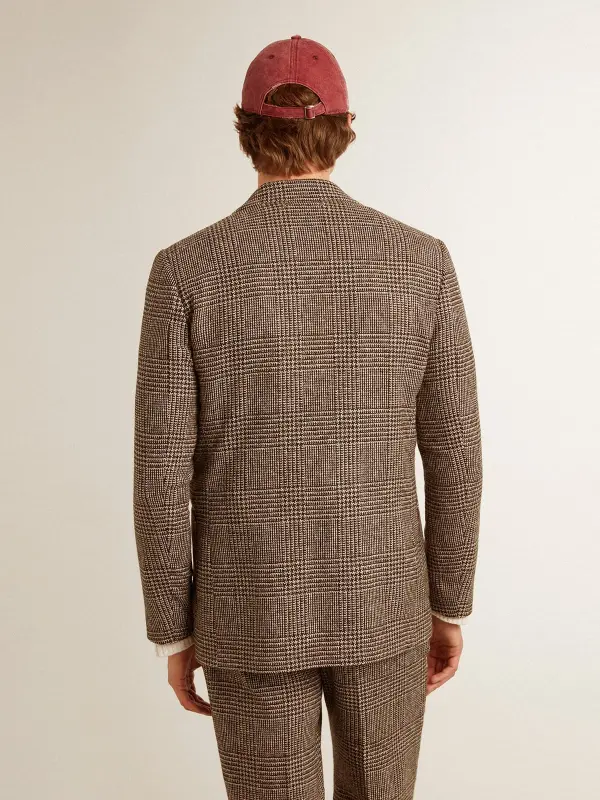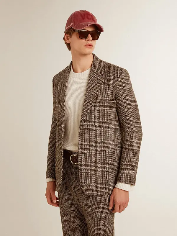 A love story to our home, Marghera. Where everything began. Our latest collection reflects the spirit of our birthplace, its contrasts, industrial soul, and manufacturing landscapes, weaving together inspirations from both the vibrant energy of workwear and the refined essence of traditional tailoring. In a regular fit, this single-breasted blazer features houndstooth wool with gray and brown contrasts. The three pockets on the front and two horn buttons add the finishing touch.