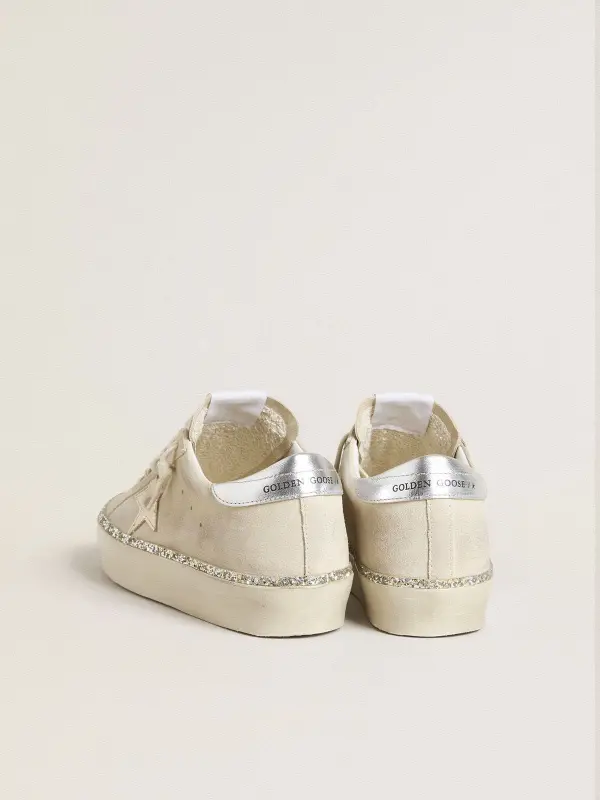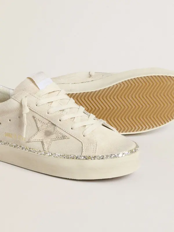 Double height and iconic design: inspired by our Super-Star sneakers, the Hi Star sneakers feature double foxing, embellished with hand lettering. This model in cream suede features a silver metallic leather star and heel tab. The silver glitter double foxing and cream-colored laces add the finishing touch.