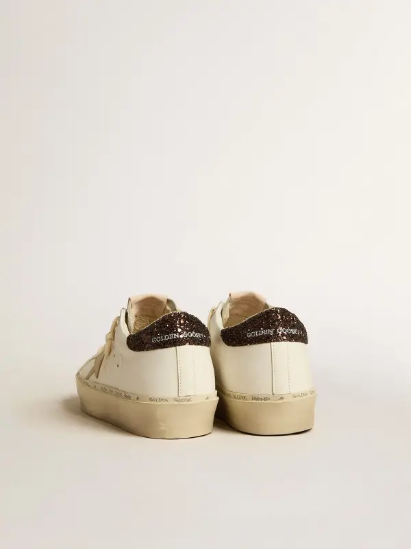 Double height and iconic design: inspired by our Super-Star sneakers, the Hi Star sneakers feature double foxing, embellished with hand lettering. This white nappa leather model features a platinum metallic leather star and brown glitter heel tab. The ice-gray suede tongue and cream laces add the finishing touch.