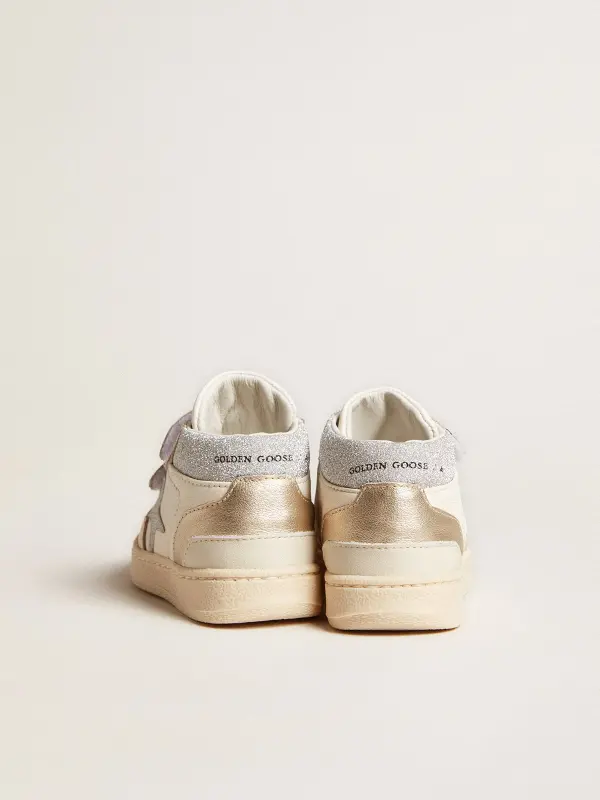 The Junior version of our June sneakers features two Velcro straps on the front. This model with a white nappa leather upper sparkles with a silver glitter star and heel tab. And platinum metallic leather inserts add the finishing touch.