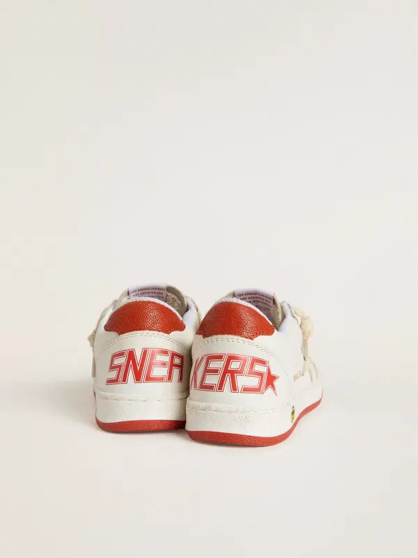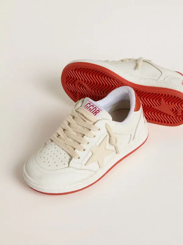 Dreaming of the Eighties. Our Ball Star sneakers have an American college vibe caught between a hoop shot and a skateboard ride. The Junior version of this model with a white leather upper features a cream-colored leather star and a red leather heel tab. The smiley detail on the foxing and cream-colored laces add the finishing touch: beautiful things that never go out of fashion.
