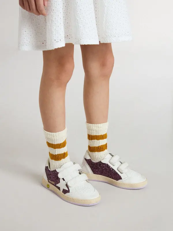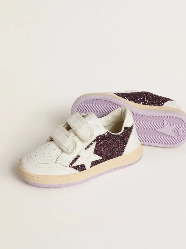 Dreaming of the Eighties. Our Ball Star sneakers have an American college vibe caught between a hoop shot and a skateboard ride. The Junior version of this model with a purple glitter upper features a white leather star and heel tab. The white leather Velcro fastening and the smiley detail on the foxing add the finishing touch: beautiful things that never go out of fashion.