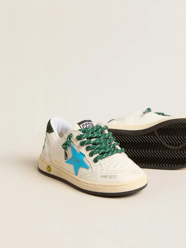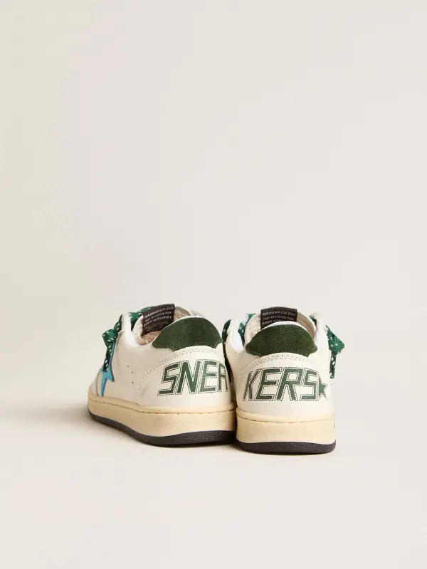 Dreaming of the Eighties. Our Ball Star sneakers have an American college vibe caught between a hoop shot and a skateboard ride. With a white nappa leather upper, the Junior version of this model features a turquoise leather star and dark green suede heel tab. The smiley detail on the foxing and the green training laces add the finishing touch.