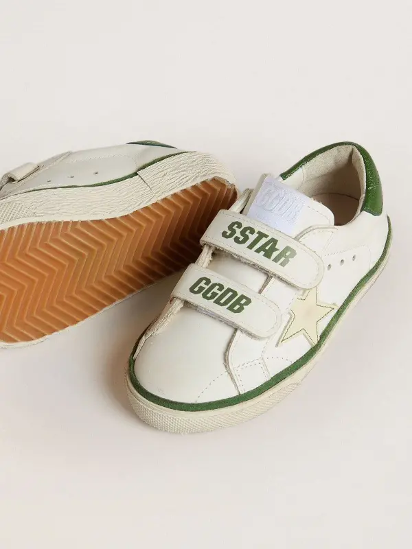 Our Old School sneakers feature two Velcro straps on the front with contrasting logo. With a white leather upper, the Junior version of this model features a cream-colored leather star with green stitching, a green nappa leather heel tab and a green suede insert. The contrasting smiley detail on the foxing adds the finishing touch.