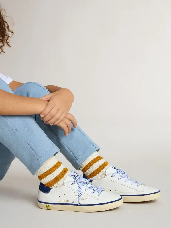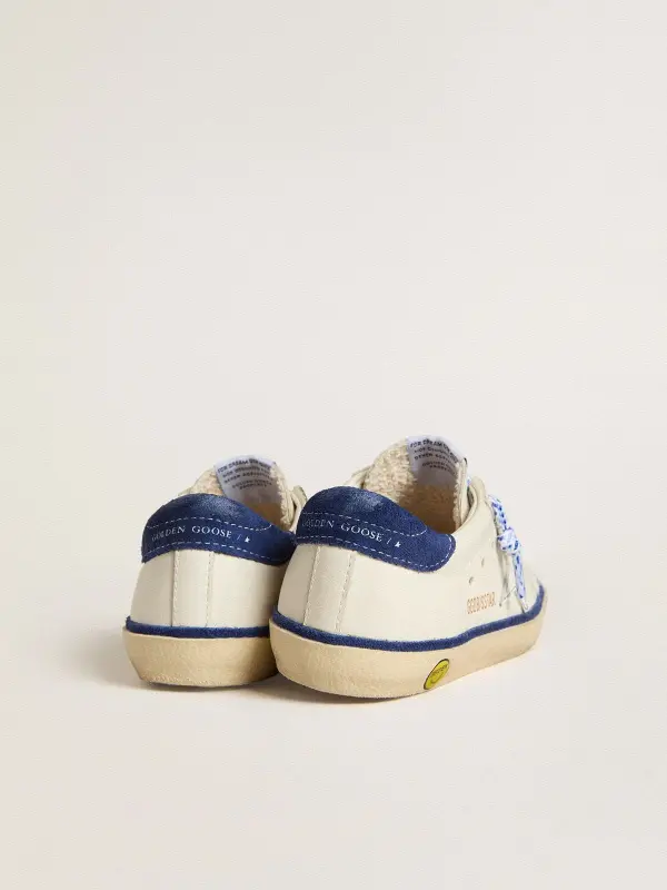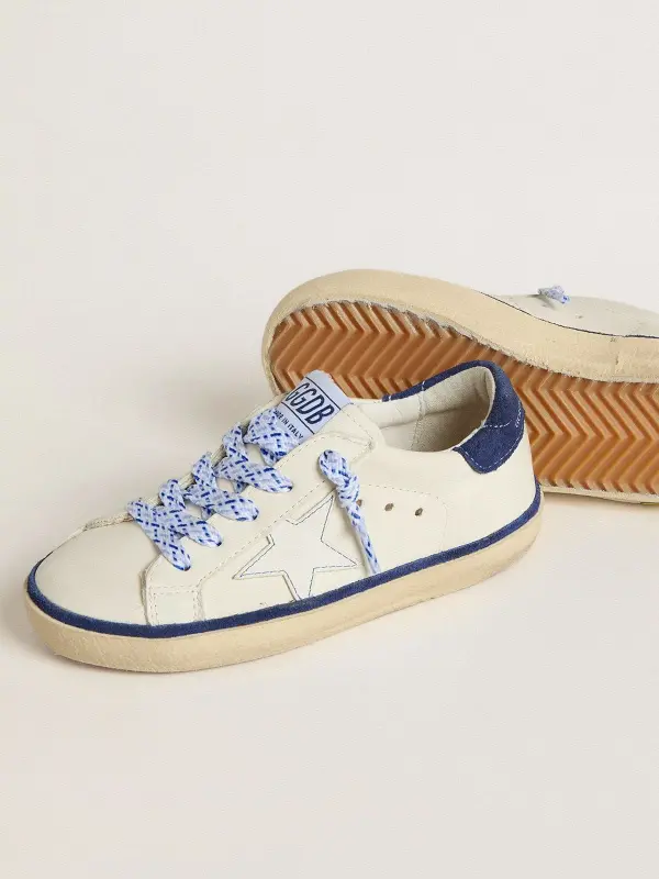 A timeless icon yet one that’s constantly evolving. At Golden, we love taking our classics and reworking them all the time, always from a new angle. This Junior version of the Super-Star with a white leather upper features a white leather star with contrast blue stitching and a blue suede heel tab. The blue and white laces add the finishing touch.