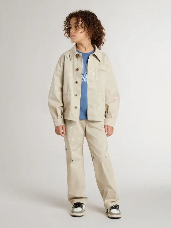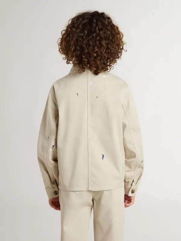 A collection with a casual soul but a versatile attitude: inspired by the Seventies, it has a timeless vintage appeal, suited to any occasion or look. With a regular fit, this unisex beige jacket features multicolor splashes. The beige branded embroidery on the breast pocket and three front pockets add the finishing touch.