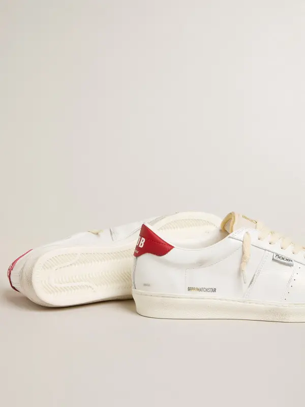 A tribute to the golden era of 1970s tennis. Our Matchstar is a theater of dreams and ever-evolving style. With a lived-in finish, this model with a glossy white leather upper features a glossy red leather heel tab with white GGDB writing. The white nylon tongue and cream-colored laces add the finishing touch.
