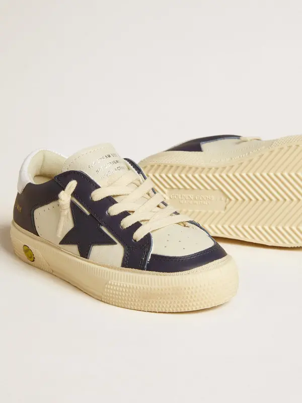 Seventies inspiration and a vintage feel meet the artisan craftsmanship typical of our sneakers. The Young version of our May sneakers features a white and blue leather upper, blue leather star and optical-white leather heel tab. The cream trim and cream laces complete the look.