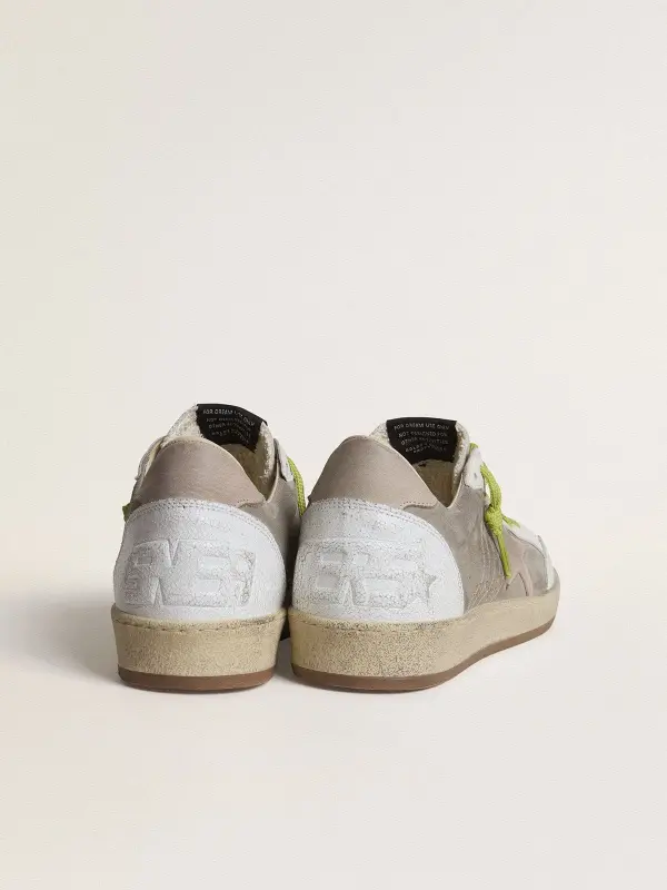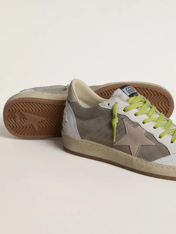 Dreaming of the Eighties. Our Ball Star sneakers have an American college vibe caught between a hoop shot and a skateboard ride. This model with a gray suede upper and white crackle leather inserts features an old rose suede star and beige leather heel tab. And the green laces add the finishing touch: beautiful things that never go out of fashion.
