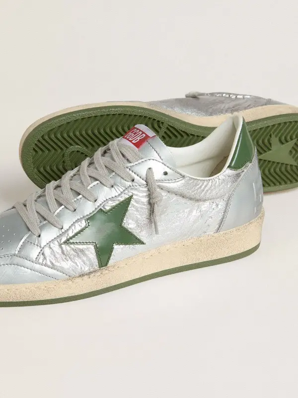 Dreaming of the Eighties. Our Ball Star sneakers have an American college vibe caught between a hoop shot and a skateboard ride. With a silver nylon upper and tone-on-tone foiled leather inserts, this men’s model features a glossy green leather star and heel tab. And the ice-gray laces add the finishing touch: beautiful things that never go out of fashion.