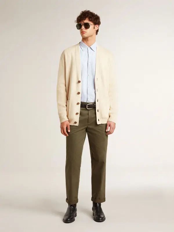 Men’s beige cardigan with ‘Golden’ lettering on the back