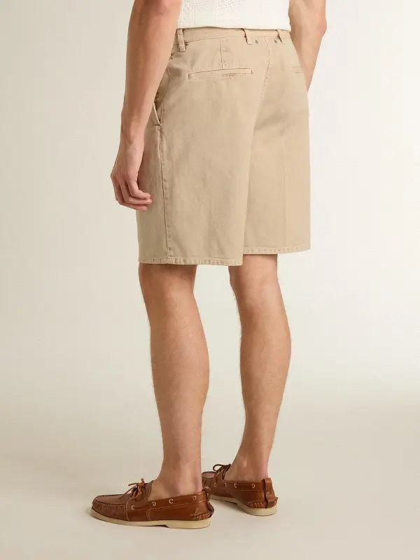 In beige washed bull denim, these men's Bermuda shorts feature a relaxed fit with front pleats and details with a lived-in look. Front and rear welt pockets complete the garment.