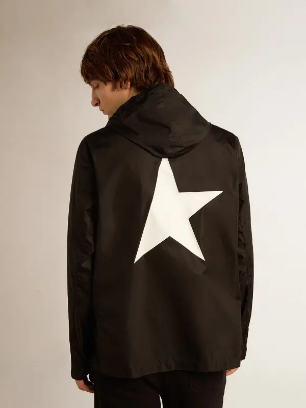 A collection with a casual soul but a versatile attitude: inspired by the Seventies, it has a timeless vintage appeal, suited to any occasion. With a zip fastening and hood, this men’s black nylon windcheater features a logo on the front and a maxi star on the back, both in white.