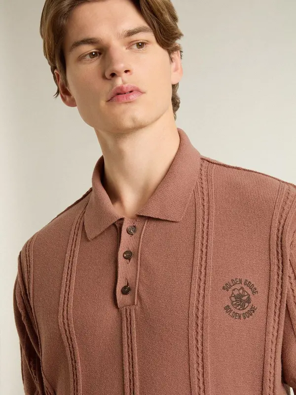 Inspired by the iconic Seventies, the carefree spirit of that era comes to life with the first drop of our Fall/Winter 25 collection. This men's polo in a brick-colored cotton blend features an embossed woven pattern and a black embroidered logo on the chest. The micro-ribbed trims and two little stars on the back add the finishing touch.