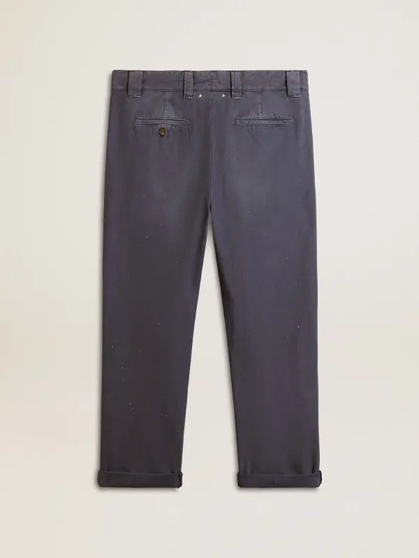 A love story to our home, Marghera. Where everything began. Our latest collection reflects the spirit of our birthplace, its contrasts, industrial soul, and manufacturing landscapes, weaving together inspirations from both the vibrant energy of workwear and the refined essence of traditional tailoring. These blue cotton chinos deliberately use the fabric on the reverse side and feature a straight leg and two front pockets. Sprays of white add the finishing touch, giving the garment a lived-in effect.