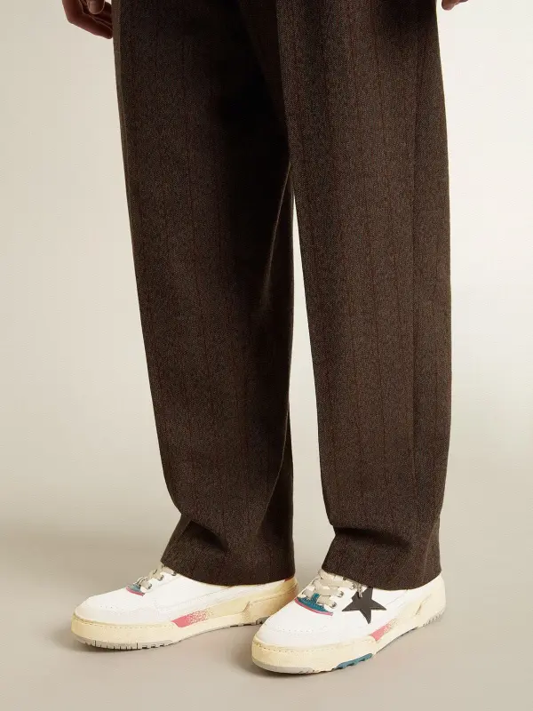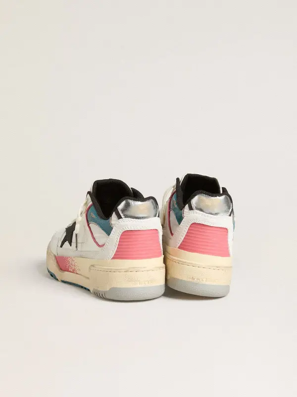 Inspired by the glory days of American basketball, the Forty2 sneaker channels the evergreen charm of the 1990s. Its chunky low-top silhouette and sporty design evoke a legendary journey, celebrating the indomitable spirit of the eternal dreamer. With a unique handcrafted construction and micro-perforated inserts, this men’s version in white leather features details with a 3D textured effect, such as the black TPU star, pink leather insert on the back, and light blue lived-in leather detail. The silver foiled leather heel tab, ombré pink sole and white laces add the finishing touch.