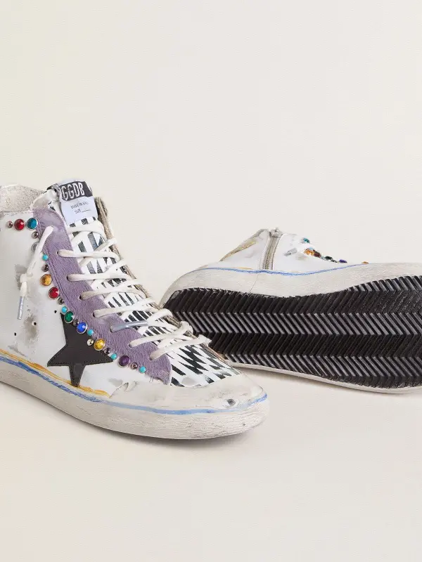 The Seventies, today: inspired by the world of basketball, the style of the Francy sneakers is updated with unexpected details and special finishes. With a distressed-effect white leather upper accentuated by multicolor studs, these men’s LAB sneakers feature a glossy black leather star and a lilac pony skin insert. A white leather tongue with contrasting black geometric print, white rubber toe, double yellow and blue stripe on the foxing, and white laces complete the look.