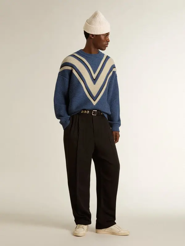 Men’s light blue jacquard wool sweater with cream-colored pattern