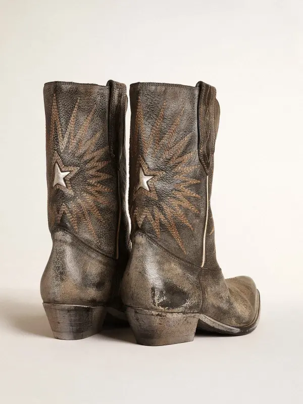 From Texas to Venice: our Wish Star Boots tell of our journey and our passions, creating a unique combination of Venetian artisan tradition and cowboy spirit. In this low men’s version, these boots feature a black leather upper with worn-out effect with silver-colored laminated leather inlay star, as well as embroidery with contrasting ecru stitching on the leg and toe. Completing the style is an ochre-colored piping detail and a gold-colored metal plaque with the Golden Goose signature engraved on the heel.