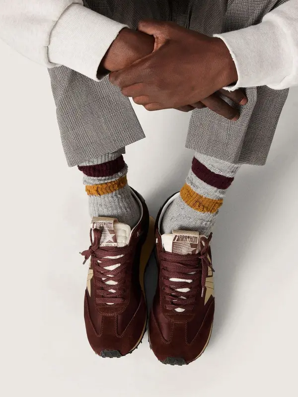 Track and field-inspired, with a Seventies flair. Day after day, our new Marathon sneakers are designed to keep you running after your dreams, paying homage to the marathon that is life. This men's model features a burgundy satin upper, a platinum metallic leather star and tone-on-tone suede inserts. The look is completed by a black leather heel tab, burgundy laces, and a starred outsole, that together make a truly unique impression.
