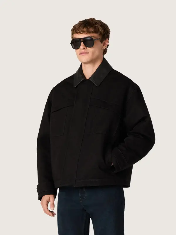 This lightly padded regular-fit men's jacket in black cotton twill with a tone-on-tone leather collar features large patch pockets and a concealed zip and snap button fastening. Details on the back, such as the iconic stars and the embroidered label with contrasting white rose and Golden Goose logo, complete the look.