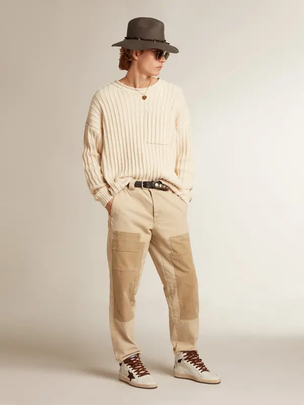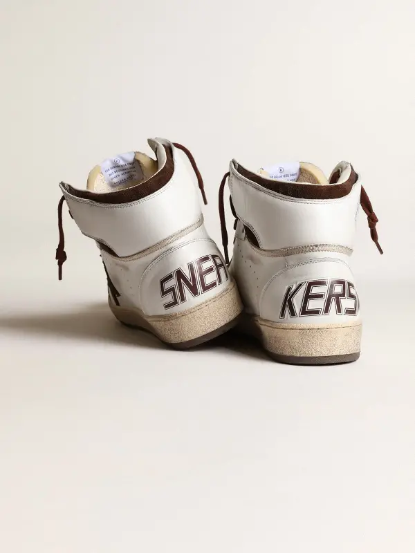 A reinterpretation of high-top sneakers with an authentic soul: inspired by our Ball Star model, our Sky-Star sneakers have an American college vibe and a feel of the basketball scene of the Eighties. This men’s model, with a white nappa leather upper, features a chocolate suede star and the Golden Goose signature on the neck of the ankle, a reference to the childhood dream of having your favorite sneakers signed by basketball legends. The chocolate suede inserts and brown laces complete the look.