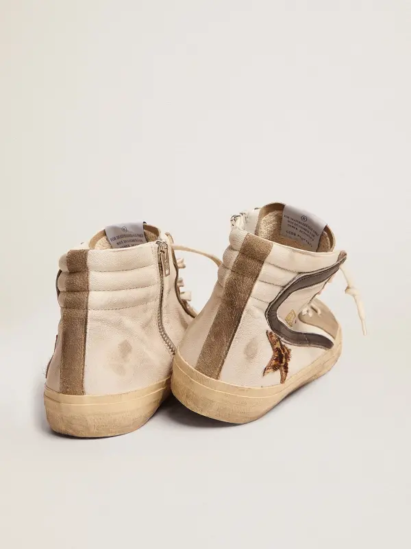 Skate soul, glamorous attitude. Our Slide sneakers take you straight to Venice Beach, between an ollie and a kickflip. This model, with a white nappa leather upper accentuated by the black leather flash with silver laminated leather edging, features a leopard-print pony skin star and dove-gray suede tongue and inserts. And white laces add the finishing touch.