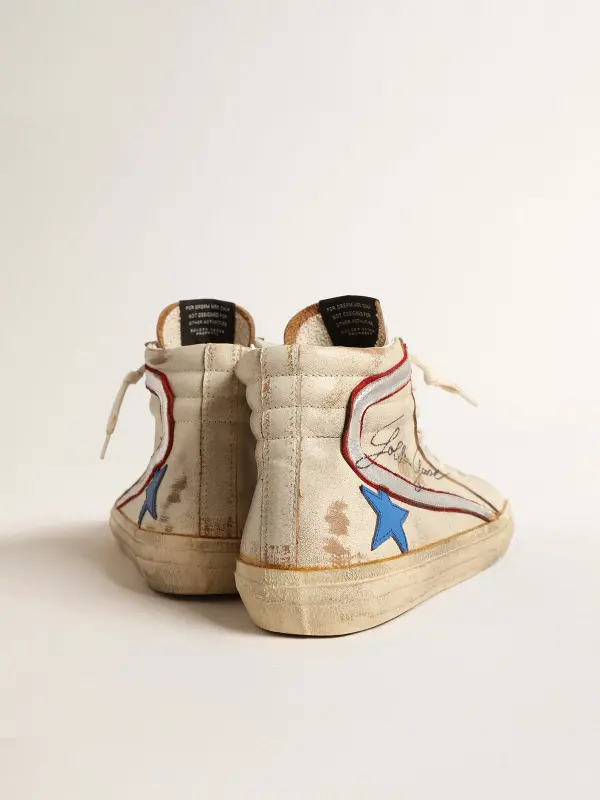Skate soul, glamorous attitude. Our Slide sneakers take you straight to Venice Beach, between an ollie and a kickflip. This model, with a white leather upper accentuated by a silver metallic leather flash with red leather edges, features a light blue leather star and the Golden Goose signature. And white laces add the finishing touch.