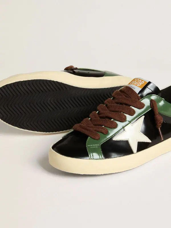 A timeless icon yet one that’s constantly evolving. At Golden, we love taking our classics and reworking them all the time, always from a new angle. These Super-Star, with a black laminated leather upper and green laminated leather inserts, feature a white leather star and heel tab. Brown laces add the finishing touch.
