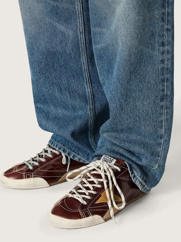 Rooted in '60s running heritage, the True-Star brings retro style and timeless performance back to the track. This men's model with a burgundy naplak upper features a toe cap, yellow suede star and beige leather insert. The sole, specially designed for the True-Star model, provides additional comfort. The metallic silver nappa leather heel tab and mismatched laces – light blue on the right shoe and white on the left – add the finishing touch.